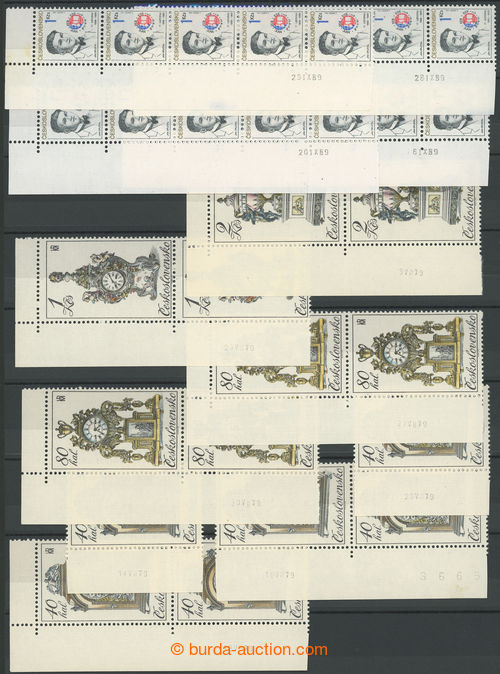 Philately. DATA TISKU / Pof.2400, 2402-2404, Historical Clocks + Pof.2916, J. Opletal, comp. 12 pcs of corner stripe or marginal stmp with various dates of print; mint never hinged (Image)