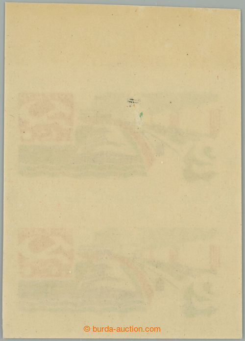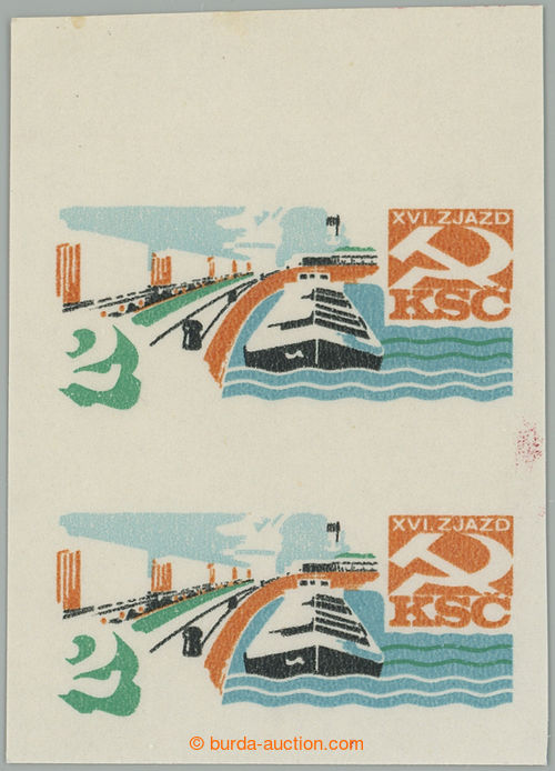Philately. PLATE PROOF Pof.2669, Successes soc. building, vertical pair with upper margin, plate proof - stage, without print red color on stamp paper with gum without perf; mint never hinged, in/at upper stamp. minor gum fault,