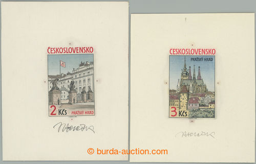 Philately. PLATE PROOF Pof.2717 + 2718, Prague castle, complete set proof copy-print color joined printings definitive gravures on chalky paper (2Kcs) resp. paper (3Kcs) without gum, wide margins, both signature Hercik; very fine (Image) (Image2)