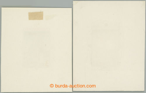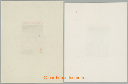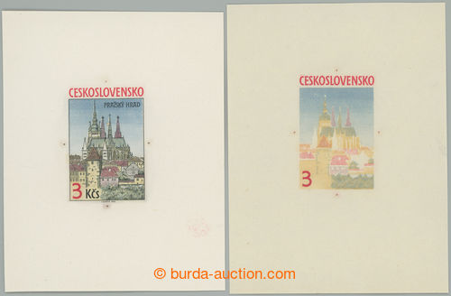 Philately. PLATE PROOF Pof.2718, Prague castle 3Kcs, comp. 2 pcs of plate proofs, master die in original colors + phase joined printing gravure colors and red color without black gravure, both prints on paper without gum with very