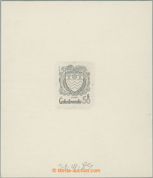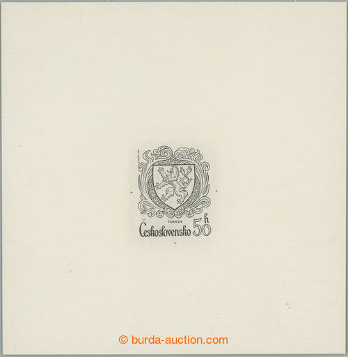 Philately. PLATE PROOF Pof.2634, City Coats of Arms - Turnov 50h, plate proof gravure in black color, on/for chalky carton with very wide margin; without defects (Image) (Image2)