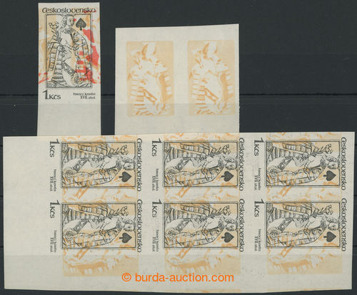 Philately. PLATE PROOF Pof.2657, Playing cards 1Kcs, trial printings on paper with gum, maculature origin, block of 6 recess printing + die-stamping with shift, pair only recess printing, stamp. with lower margin die-stamping