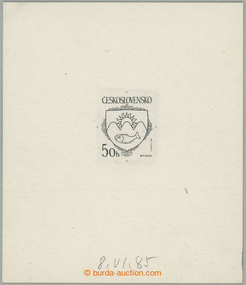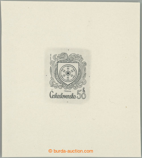Philately. PLATE PROOF Pof.2681, City Coats of Arms - Trnava 50h, master die in black color on chalky paper with wide margin; without defects