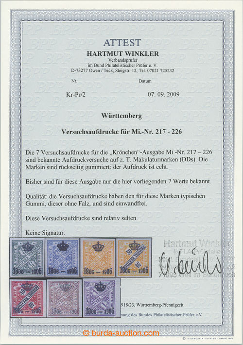 Philately. Mi.219U-226U, overprint imperforated Numerals 5Pf - 1M; superb, certificate Winkler BPP, c.v.. 840EUR, rare (Image) (Image2)