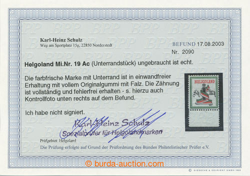Philately. Mi.19Ac, unissued Coat of arms 1Sh/1M, unused with lower margin; hinged, o.g., certificate Schulz, c.v.. for * 100EUR - undervalued