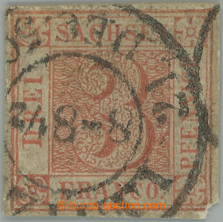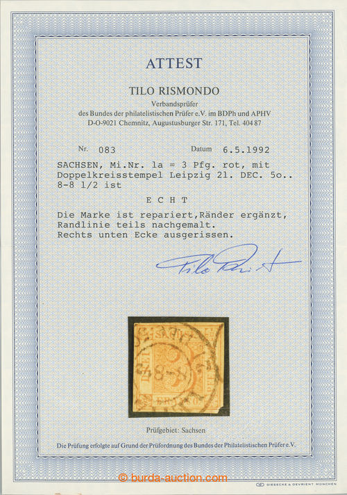 Philately. Mi.1, Numerals 3Pfg red, used example with CDS LEIPZIG 21.DEC.; heavily repaired, however still presentable spacefiller with certificate Rismondo BPP, c.v.. 8.500EUR, scarce stamp (Image) (Image2)