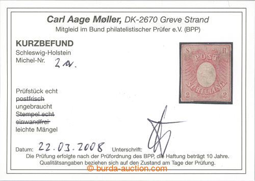Philately. Mi.2a, Coat of arms 2S rose; unused piece with certificate Moller BPP, minor faults, c.v.. 700EUR (Image) (Image2)