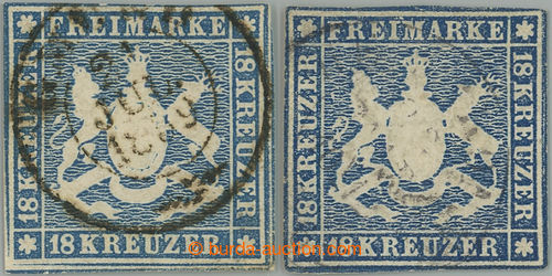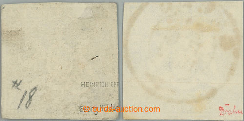 Philately. Mi.10, 18, Coat of arms 18Kr issue 1857 and ditto issue 1859; two used examples, margins and minor faults, overall good quality, exp. Drahn, Buhler and Heinrich, c.v.. 3.100EUR, rare classic stamps (Image) (Image2)