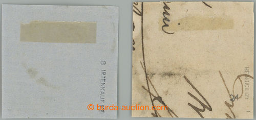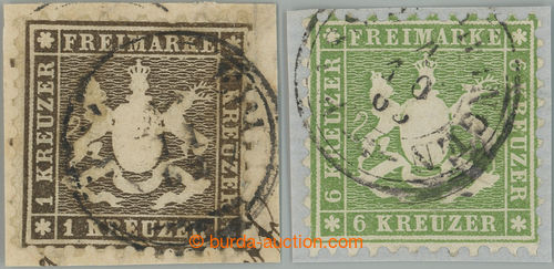 Philately. Mi.21, 23a, Coat of arms 1 Kr brown + 6 Kreuzer olive green, both on small cut-squares, perf 10; overall good quality, exp. Heinrich BPP and Irtenkauf BPP, c.v.. 750EUR (Image) (Image2)