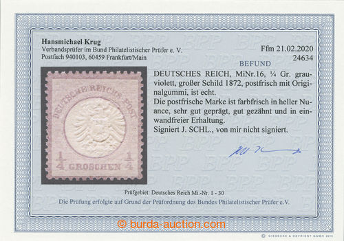 Philately. Mi.16, Coat of arms ¼Gr grau violett; fine piece with certificate Krug, exp. Schlesinger, c.v.. 300EUR++ (Image) (Image2)
