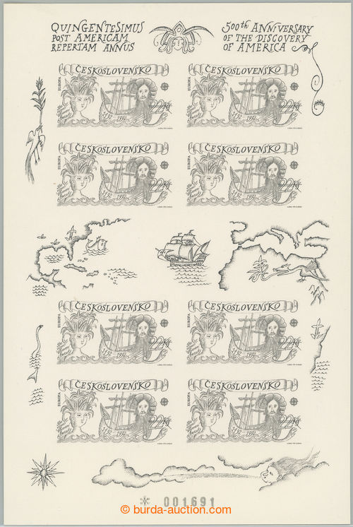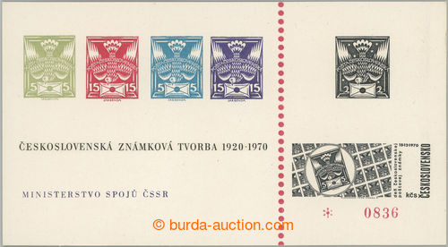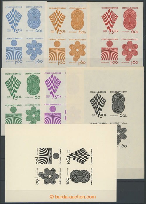 Philately. unrealised vitezny stamp design 20. years Czechoslovakia, author I. Strnad, 6 pcs of bloks of four in various colors on paper with gum + black print on chalky paper without gum; without defects, design is stated in/at