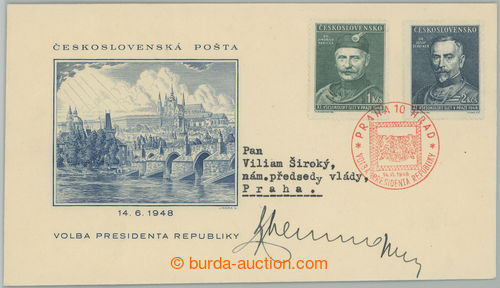 Philately. PRESIDENTIAL ELECTION / envelope V A/48, mounted stamp. Pof.475, 477, red special postmark PRAGUE 10 HRAD/ 14.VI.48, signature Neumann, sent to V. Sirokeho (!); very fine (Image) (Image2)
