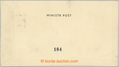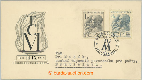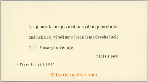 Philately. MINISTERSKE FDC / M 5/47, Masaryk, mounted stamp. Pof.458-459, special postmark PRAGUE 10 HRAD/ 14.IX.47/a, Us, on reverse Minister post and No. 184, also with card with dedication; very fine (Image) (Image2)