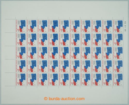 1912 nh imagePhilately. COUNTER SHEET / Pof.63 production flaw, European agreement 8CZK, complete unfolded 50 pcs of sheet on paper fl-an-OF and WITHOUT CISLA counter sheet in UR corner with date 2.I.95 (this day with tiskly mainly stamp. on/for common paper fl-sp1-OF); also single mint never hinged stamp. on/for this paper occur quite exceptionally, new c.v.. first-time shows, but significantly misvalues, in/at sheet probably UNIKAT, on request certificate labour (Image) (Image2)