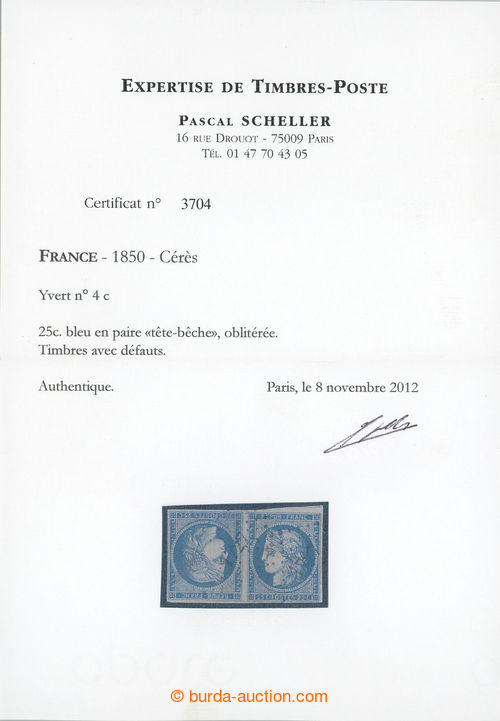 Philately. Yv.T4c, Maury 4T, horiz. opposite facing pair Ceres 25c blue, used; full margins, small defects, certificate Scheller, c.v.. Maury 20.000EUR, rare offer (Image) (Image2)