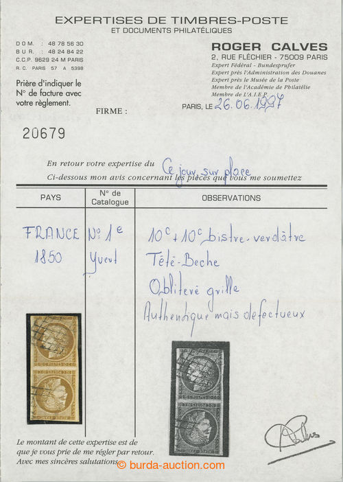 Philately. Yv.1c, Maury T1c, vertical opposite facing pair Ceres 10c bistre-verdatre, used; irregular margins, small defects, certificate Calves, exp. Scheller, c.v.. Maury 30.000EUR (!), extremely rare (Image) (Image2)