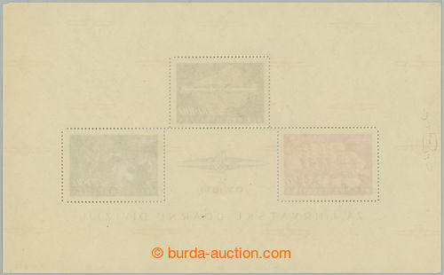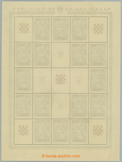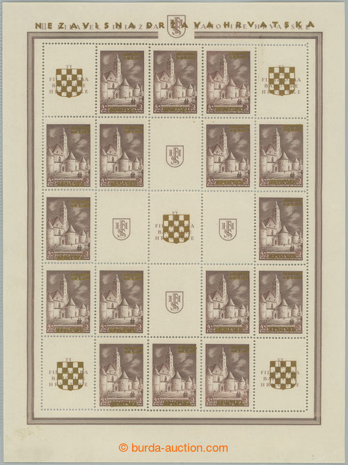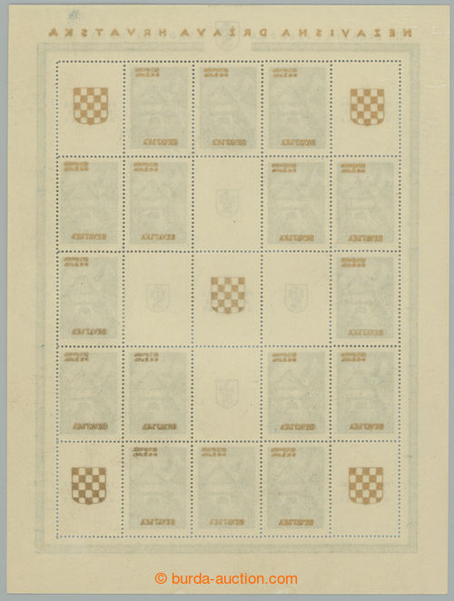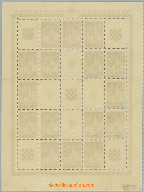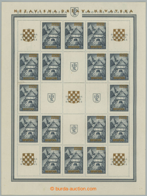 Philately. Mi.Klb39A,B, complete printing sheet as miniature sheet NEZAVISNA DRZAVA HRVATSKA, 16x 1,50Din with gold overprints, right column with rare line perf; lower minor faults, overall fine, rare (Image) (Image2)