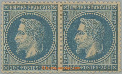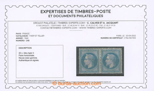 Philately. Yv.29B, Napoleon III. EMPIRE FRANCAIS 20C blue, type II., unused horizontal pair; very fine pair with large part original gum, certificate Calves-Jacquart, exp. Calves, c.v.. Maury 700EUR (Image) (Image2)