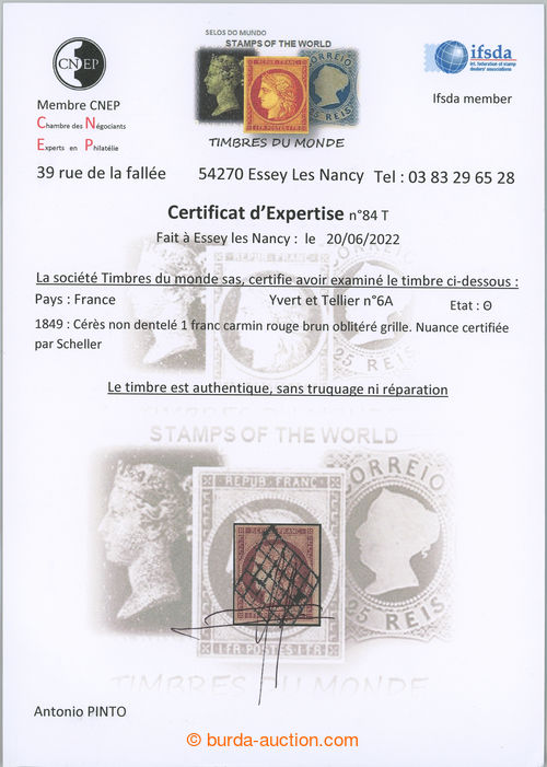 Philately. Yv.6A, Ceres REPUB FRANC 1Fr carmin rouge brun, beauty grid pmk.; fine piece with full to wide margins, exp. Scheller, c.v.. Maury 1.200EUR (Image) (Image2)