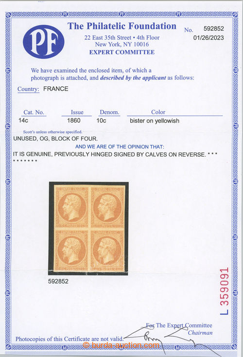 Philately. Yv.13B, Napoleon III. EMPIRE FRANC 10C, type II, unused block of four; extraordinary quality, lightly hinged, certificate The Philatelic Foundation N.Y., exp. Scheller, c.v.. 4.800EUR++, rare multiple! (Image) (Image2)