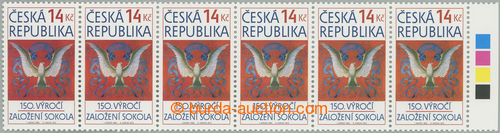 2029 nh imagePhilately. Pof.711 production flaw, 150. Anniv Sokol 14CZK, right marginal horiz. str-of-6, L to R with menici color from carmine on/for cervenohnedou (Image) (Image2) (All Images)