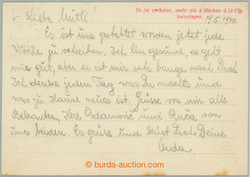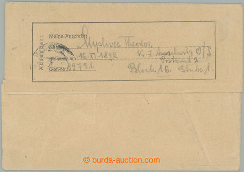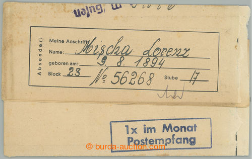 217 imagePhilately. C.C. GUSEN / preprinted folded letter, determined for C.C. Mauthausen / Gusen, hand-made repaired, franked with. Bohemian and Moravian (!) stamp. A. Hitler 1,20 Koruna, CDS SANKT GEORGEN / GUSEN 04.5.44, adresovano to Bohemia-Moravia, line censorship mark Poststelle (mail room) K.L.M./Gusen/ zensiert..... with signature; torn in margin, toned (Image) (Image2) (All Images)