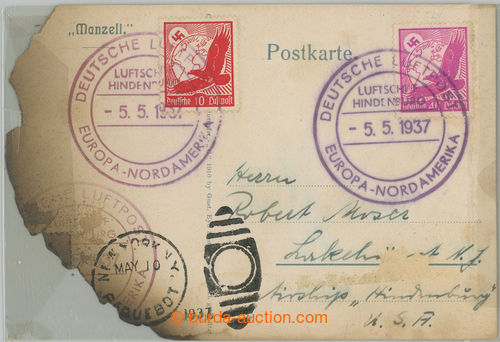 206 imagePhilately. WRECK & CRASH MAIL HINDENBURG - 1. North America Fahrt 1937/ Sieger 454Dc, postcard from Zeppelin HINDENBURG crash, burned during the landing in Lakehurst on 6th of May, franked with airmail stamps 10+40Pfg and other stamp originally left lower, with deck postmarks Type IX LUFTSSCHIFF HINDENBURG 5. 5. 1937 and with postmark NEW YORK N.Y. MAY 10 / PAQUEBOT; very fine, Sieger 60.000EUR (!), extremely rare item! (Image) (Image2) (Image3) (Image4) (Image5) (Image6) (All Images)