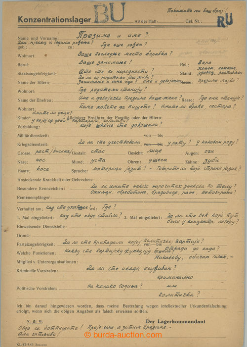 213 imagePhilately. C.C. BUCHENWALD / unfilled blank form for registration of new prisoner (mark RU for prisoner from territory of USSR), used as note paper and like that after war carried out; minor faults, good condition (Image) (Image2) (All Images)