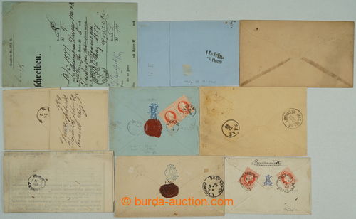 Philately. SELECTION of / 9 letters with Franz Joseph values 2 Kreuzer, 5 Kreuzer and 10Kr, i.a. 2x Reg letter 3x 5 Kreuzer, 2x folded Printed matter with 2 Kreuzer, 1x request sheet with mounted stamp 10Kr, various CDS i.a. small