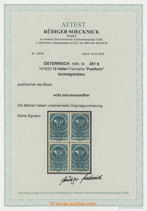 Philately. ANK.261b, block of four POSTHOR, 12h in rare color dark green-blue; mint never hinged, small paper fault, certificate Soecknick, c.v.. 1.250EUR (Image) (Image2)