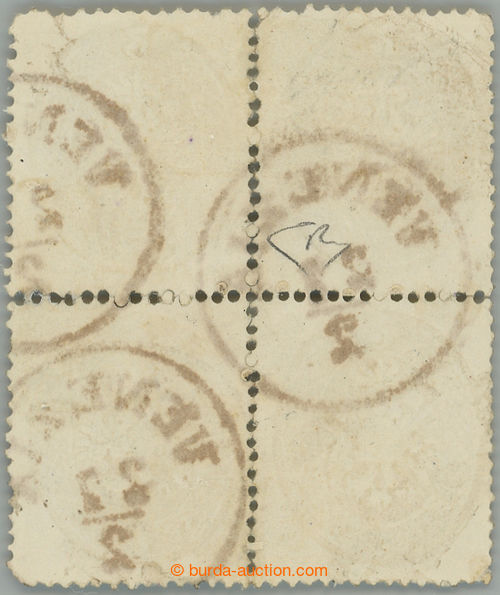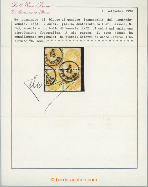 288 bl/4 imagePhilately. Sass.36, Coat of arms 2Sol yellow, block of four with print cancel. VENICE; small faults, certificate and exp. Enzo Diena, c.v.. 17.000EUR, very rare multiple in fine quality! (Image) (Image2) (Image3) (All Images)