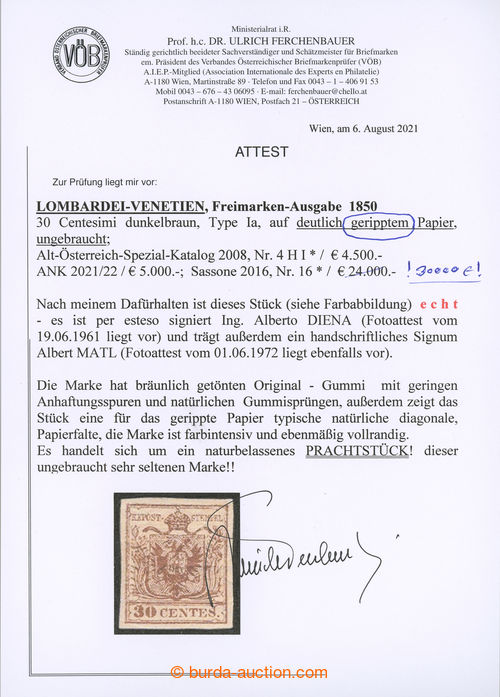 283 og imagePhilately. ANK.4HI, Coat of arms 30Cts GERIPPTES PAPIER; very fine and rare stamp with original gum and certificate Ferchenbauer - PRACHTSTUCK, exp. A. Diena, c.v.. 5.000EUR, Sassone 30.000EUR (!) (Image) (Image2) (Image3) (All Images)
