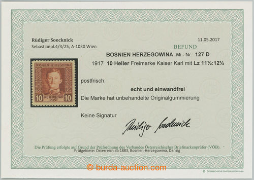 296 nh imagePhilately. ANK.127D, Charles I. 10h brown with rare perf Lz 11½ : 12½; mint never hinged, c.v.. 470EUR, certificate Soecknick, sought Bosnian speciality (Image) (Image2) (Image3) (All Images)