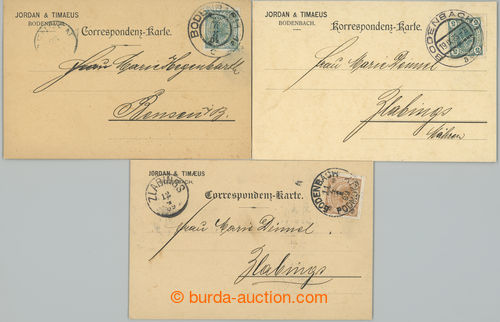 Philately. CZECH LANDS / Mng.J103, comp. of 3 commercial PC f. Jordan & Timaeus from Podmokly, perffin J.&T. on stamp Franz Joseph, 1x 2 Kreuzer brown and 2x with 5h, all with mailing CDS BODENBACH, perfin good condition (Image) (Image2)