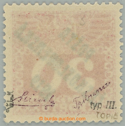 Philately. Pof.70, Large numerals 30h red, overprint type III.; lightly hinged, overall very fine example sought stamps with certificate Vrba, exp. Hirsch and Tribuna (Image) (Image2)