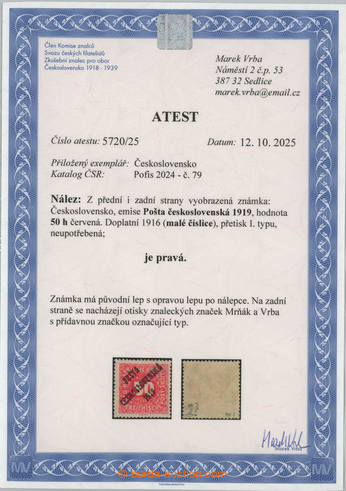 Philately. Pof.79, Small numerals 50h red, overprint type I.; reparation hinged, Vrba certificate, exp. Mrnak (Image) (Image2)