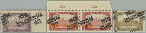 Philately. Pof.111, 114, 115 production flaw, selection of values Parliament 50f, 1 Koruna (horizontal pair) and 2 Koruna with significant shifts overprints, 2x marginal; hinged (Image) (Image2)