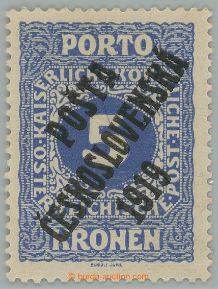Philately. Pof.81, Small numerals 5 Koruna blue, type I.; label, prohnuti paper, exp. Buhler and Vrba (Image) (Image2)