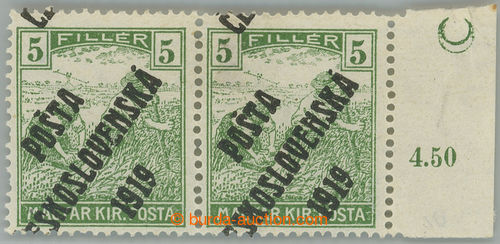 Philately. Pof.103 plate mark, 5f green, horizontal pair with R margin with plate mark - crescent; heavy hinge on/for right stamp., exp. Vrba, rare usage, sought! (Image) (Image2)