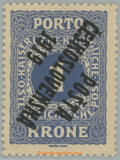 Philately. Pof.80 Pp, Small numerals 1 Koruna blue with inverted opt I. type; hinge / label, short tooth, exp. Kovar and Vrba, rare usage