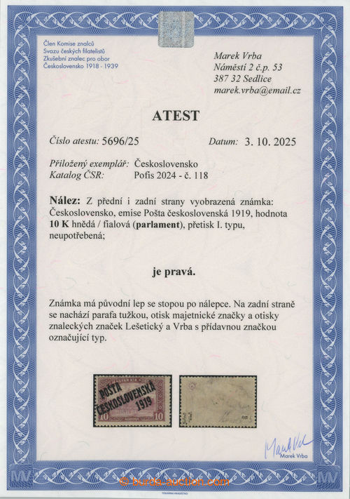 Philately. Pof.118, 10K brown / violet, overprint type I.; hinged, minor faults in corner, Vrba certificate, exp. by Gilbert., Kessler and Vrba, sought and rare stamp! (Image) (Image2)