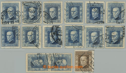 Philately. Pof.191A, Gravure 2CZK blue, commercial comp. 10 pcs of cancel. stamp. with wmk P2, 2 pcs of P3, vertical pair P4 and value 3CZK with P3; mainly nice quality, all marked and expertized, c.v.. 3.100CZK (Image) (Image2)