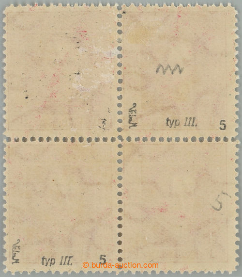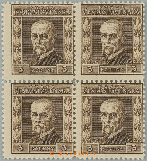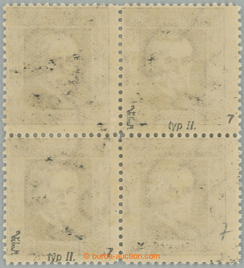 Philately. Pof.196 II, Gravure 3CZK brown, block of four, type II., wmk P7; mint never hinged, minor gum fault after/around prichyceni to background, exp. Vrba, sought (Image) (Image2)