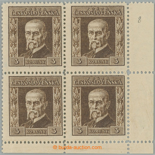 Philately. Pof.192B, Gravure 3CZK brown, LR corner blk-of-4, wmk P8; mint never hinged, exp. Vrba, sought (Image) (Image2)