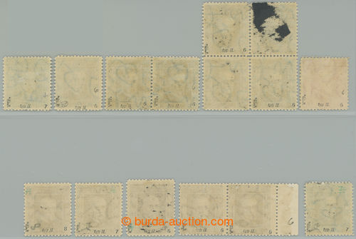 Philately. SELECTION of / Pof.194-196, Gravure 1CZK - 3CZK, comp. of stamps II. typu: 1CZK with P6 (*), block of four 2CZK with P6, ditto as Pr, then single 2CZK with P6 and P7 (2x), 3CZK pair with P6 + single stamp. with P6 - P8;