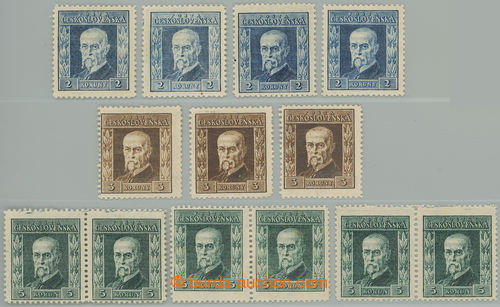 Philately. SELECTION of / Pof.191B, Gravure 2CZK blue, complete set according to wmk P5 - P8 + Pof.192B, 3CZK with P5, 7 and 8, then 3 pcs of pairs 5CZK green with vert. wmk P1, 2 and 3; hinged, Pof.193A, 5CZK minor gum fault, all