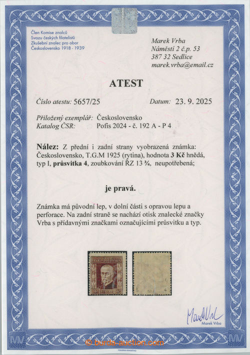 Philately. Pof.192A, Gravure 3CZK brown, type I., vertical wmk P4; small reparation lower, overall but fine piece, Vrba certificate, rare stamp!