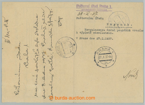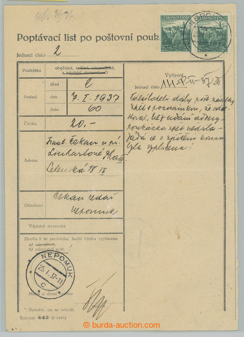 1329 imagePhilately. SHEET POPTAVACI perforation hole POSTAL POUKAZCE / used printed matter (442 (I-1931))., fee paid two stamp. Zvikov 2CZK, Pof.307, CDS NEPOMUK 25.I.37, on reverse answer with CDS PRAGUE 1/ 27.I.37; only fold (Image) (Image2) (All Images)