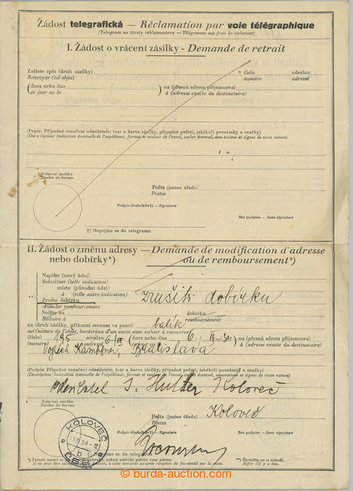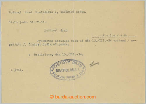 1328 imagePhilately. ZADOST O VRACENI MAILING NEBO ZMeNU ADRESY / used international printed matter (109 No.. (III.-1930)) fee paid stamp. Orava 3CZK, Pof.224, CDS KOLOVEC 13.III.34, answer with CDS BRATISLAVA 1/ 14.III.34; only cross fold (Image) (Image2) (Image3) (All Images)
