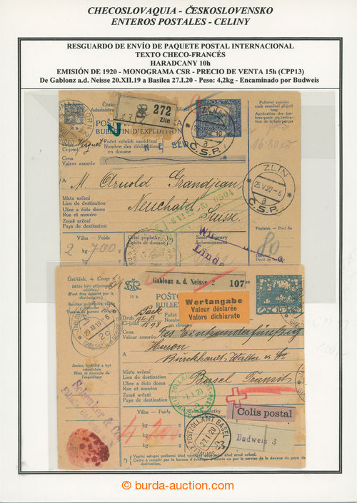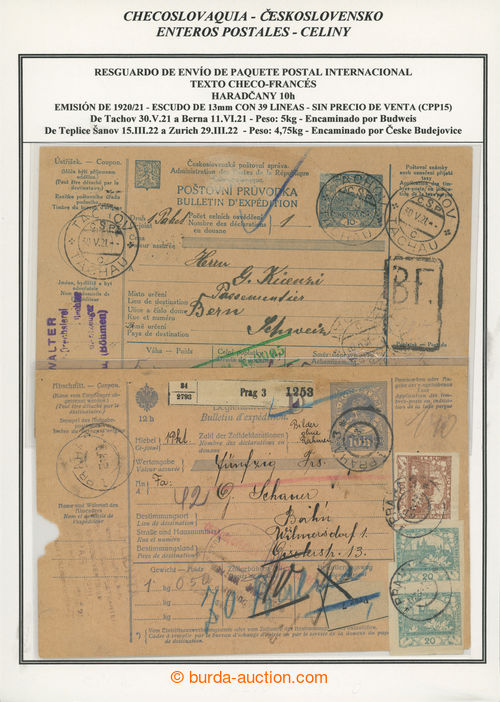 1321 imagePhilately. CPP14b + CPP15 + CPP16, Hradcany 10h blue with emblem, comp. 3 pcs of various Us complete p.stat dispatch-notes addressed to Germany and Switzerland, 1x uprated with stamp T. G. Masaryk 40h; 2 pcs of light prehyb (Image) (Image2) (All Images)